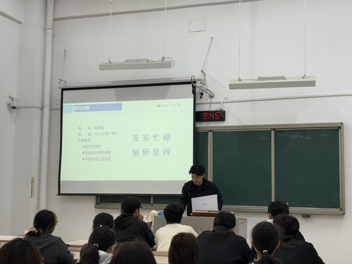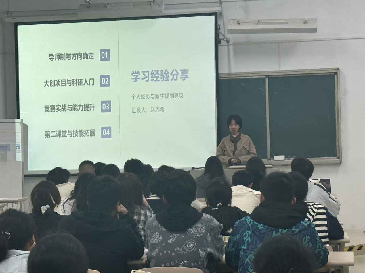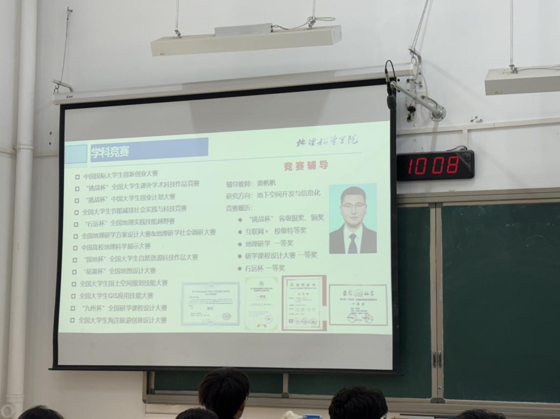 2023级地理科学基地班的赵周希建议大家积极探索,尽早规划。她为同学们讲解了本科生导师制,鼓励大家提早确定发展方向,积极主动与导师沟通,争取更多实践机会。此外,她还重点介绍了大创竞赛,希望同学们积极参与、“以赛促学”,通过比赛平台提升专业能力,开拓视野,深化科研成果。