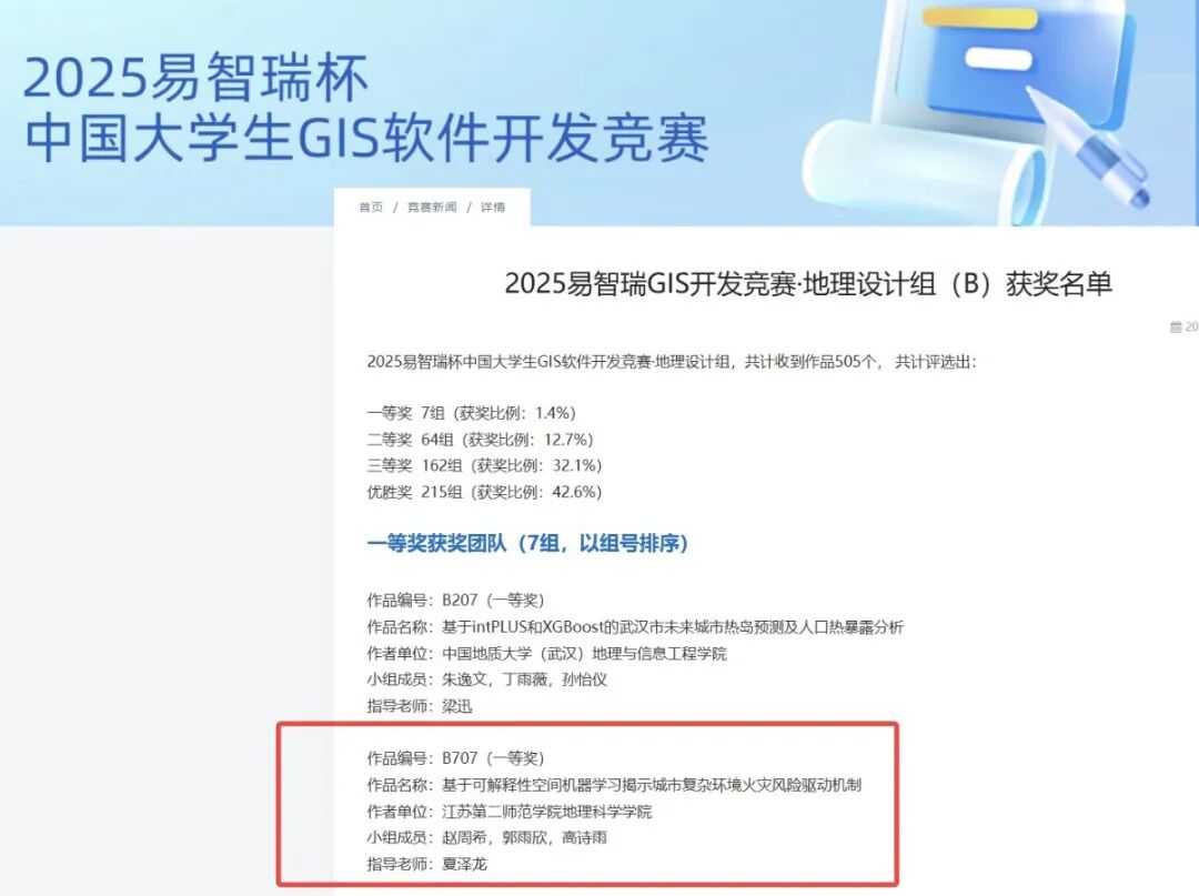近日,2025年易智瑞杯中国大学生GIS软件开发竞赛评选结果正式揭晓。由我院地理科学专业赵周希、郭雨欣、高诗雨三位同学共同完成,夏泽龙老师指导的作品——《基于可解释性空间机器学习揭示城市复杂环境火灾风险驱动机制》,在地理设计组(B)的激烈角逐中脱颖而出,最终斩获一等奖(最高奖项)。